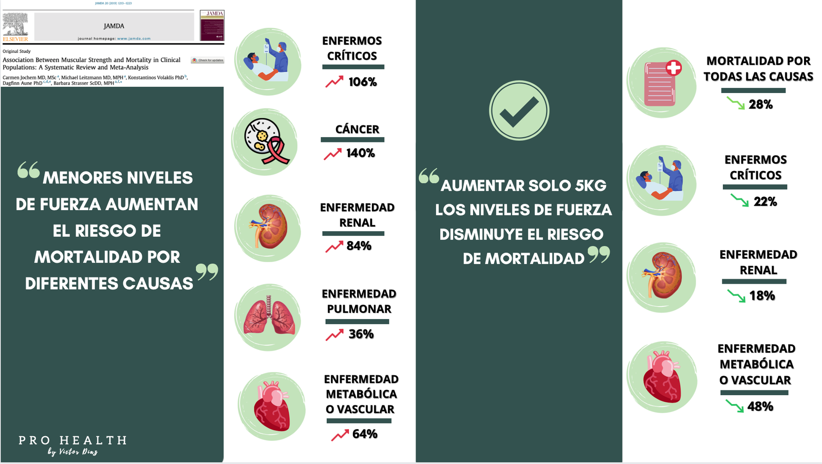 Los niveles de fuerza muscular se relacionan de forma inversa con la mortalidad por cualquier causa en población con enfermedad cardiovascular, enfermedad arterial periférica, cáncer, insuficiencia renal, enfermedad pulmonar obstructiva crónica, artritis reumatoide y enfermedades críticas (Volaklis et al., 2015).